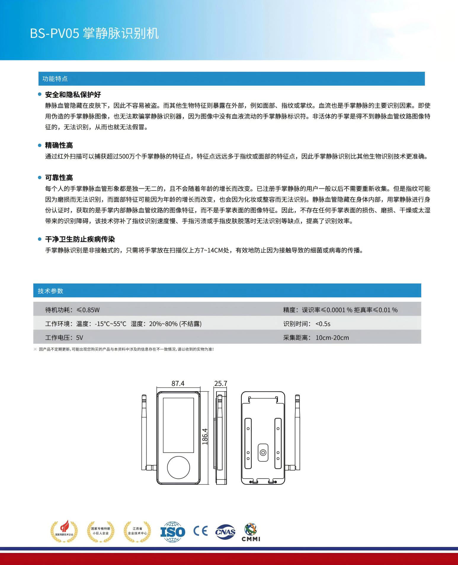 每個(gè)人的手掌靜脈血管形象都是獨(dú)一無二的,且不會(huì)隨著年齡的增長而改變。已注冊(cè)手掌靜脈的用戶一般以后不需要重新收集。但是指紋可能因?yàn)槟p而無法識(shí)別,而面部特征可能因?yàn)槟挲g的增長而改變,也會(huì)因?yàn)榛瘖y或整容而無法識(shí)別。靜脈血管隱藏在身體部,用掌靜脈進(jìn)行身份認(rèn)證時(shí),獲取的是手掌內(nèi)部靜脈血管紋路的圖像特征,而不是手掌表面的圖像特征。因此,不存在任何手掌表面的損傷、磨損、干燥或太濕帶來的識(shí)別障礙,該技術(shù)彌補(bǔ)了指紋識(shí)別速度慢、手指污漬或手指皮膚脫落時(shí)無法識(shí)別等缺點(diǎn),提高了識(shí)別效率。