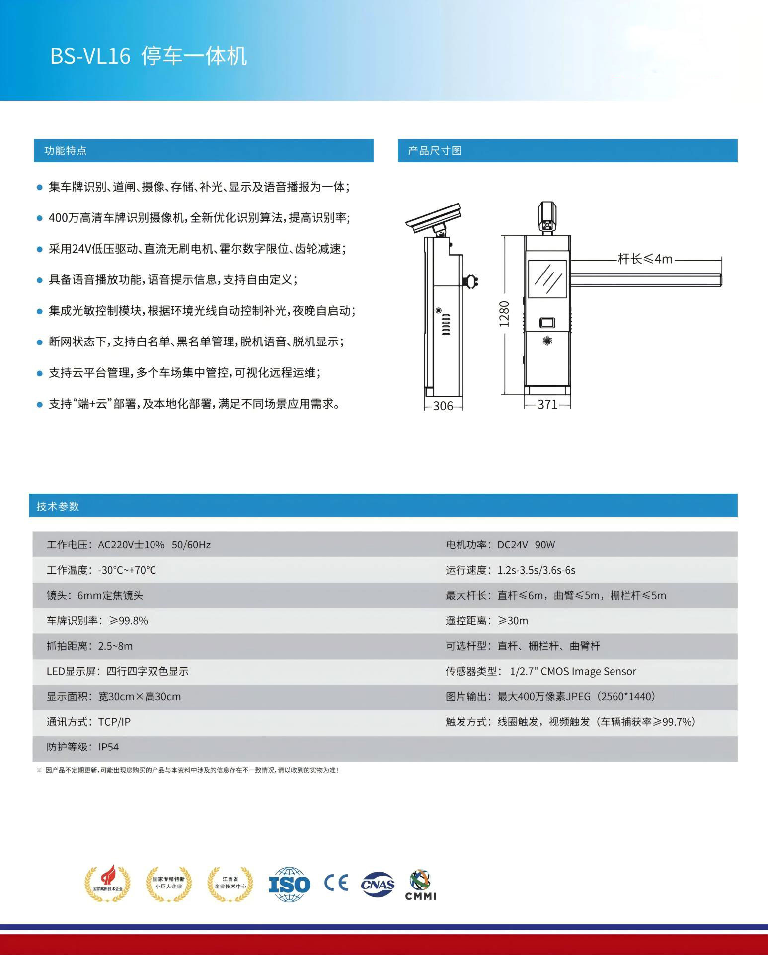 ●集車牌識(shí)別、道閘、攝像、存儲(chǔ)、補(bǔ)光、顯示及語音播報(bào)為一體;